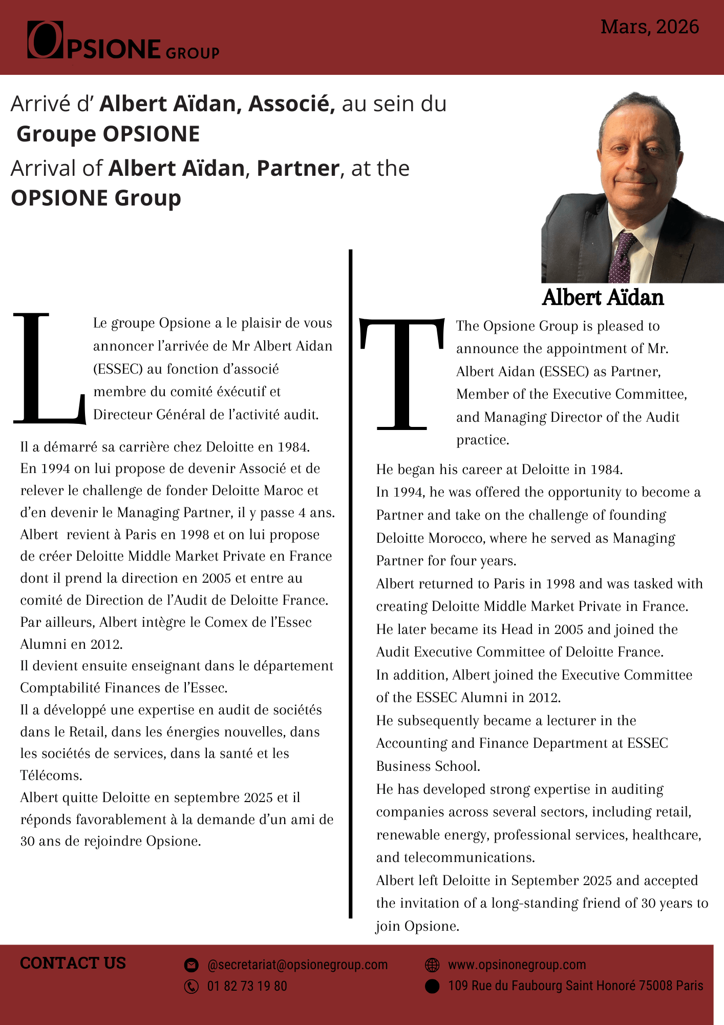 Le groupe Opsione (Audit, Expertise, Conseil) et son confrère, le groupe CAD (Castagnet, CMMA, Exavision), ont le plaisir de vous annoncer leur rapprochement effectif depuis le 1er février 2024.